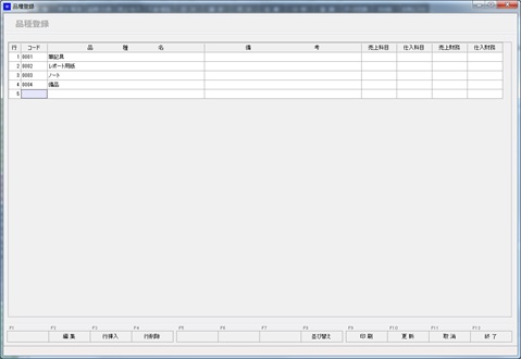 分類コードを入力します。コード欄では行挿入や行削除、並び替え、更新、取消を指定できます。