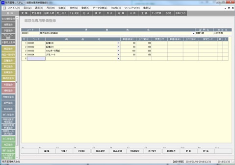 得意先専用単価を登録します。売上伝票で単価を表示する際ここで登録した単価が規定値として表示されます。登録メニューから得意先専用単価登録を選択して起動します。(ここでは主に得意先得意先専用単価登録について説明しますが仕入先専用単価登録も同様の方法で操作できます。)