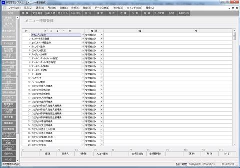 メニュー権限を登録します。ユーザー権限に応じて使用できるメニューを設定します。メニュー権限に登録されていないメニューは全てのユーザーが使用できます。その他メニューからメニュー権限登録を選択して起動します。