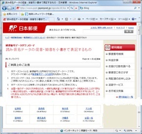 郵便番号データは下記のサイトから都道府県一覧にある「全国一括」をダウンロードして解凍します。