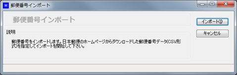 郵便番号データをインポートします。インポートボタンをクリックして日本郵便のサイトからダウンロードした郵便番号データ(KEN_ALL.CSV)を指定して下さい。