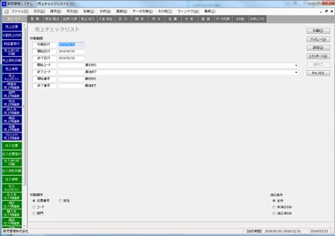 売上伝票から売上チェックリストや売上明細表を印刷します。売上・仕入メニューから売上チェックリスト、得意先売上明細表、納入先売上明細表、商品売上明細表、プロジェクト売上明細表を選択して起動します。(ここでは主に売上明細表について説明しますが仕入明細表も同様の方法で操作できます。)