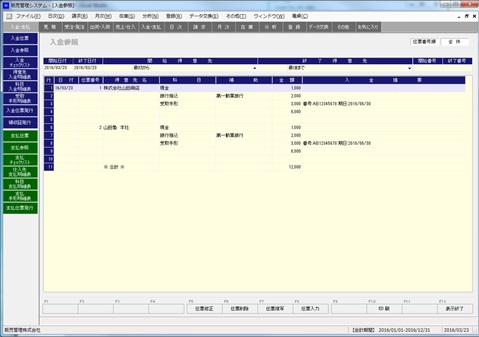 入金伝票の参照画面を表示します。参照画面から入金伝票の修正・削除画面を起動することができます。入金・支払メニューから入金参照を選択して起動します。(ここでは主に入金参照について説明しますが支払参照も同様の方法で操作できます。)