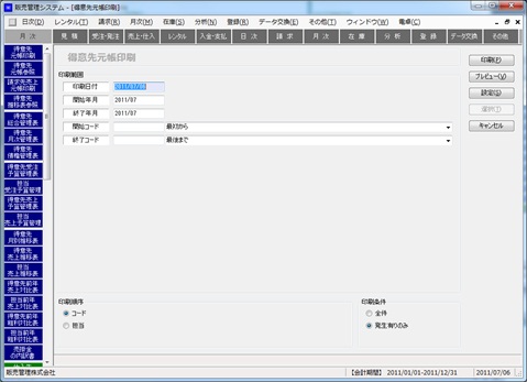 得意先元帳を印刷します。月次メニューから得意先元帳印刷を選択して起動します。(ここでは主に得意先元帳印刷について説明しますが請求先売上元帳印刷、仕入先元帳印刷、請求先仕入元帳印刷も同様の方法で操作できます。)