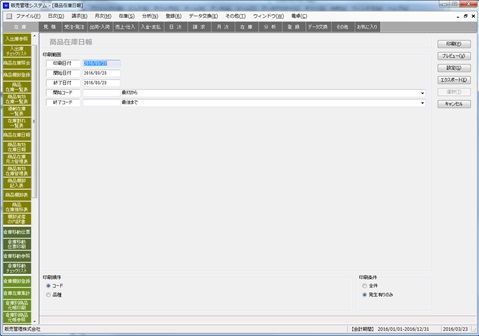 商品在庫日報を印刷します。在庫メニューから商品在庫日報、商品有効在庫日報を選択して起動します。