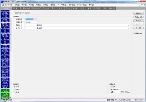 売掛金の内訳書を印刷します。月次メニューから売掛金の内訳書を選択して起動します。(ここでは主に売掛金の内訳書について説明しますが買掛金の内訳書も同様の方法で操作できます。)
