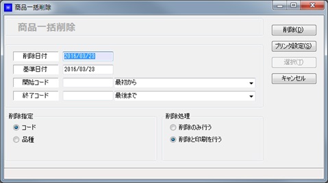 基準日付を指定して商品を一括削除します。基準日付以前の登録で基準日付以降に取引のない在庫数0の範囲内の商品を全て削除します。登録メニューから商品一括削除を選択して起動します。