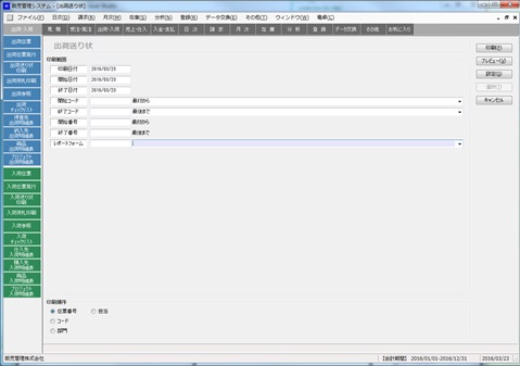 出荷伝票から送り状を印刷します。出荷・入荷メニューから出荷送り状印刷を選択して起動します。(ここでは主に出荷送り状について説明しますが入荷送り状も同様の方法で操作できます。)