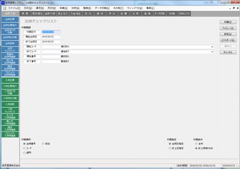 出荷伝票から出荷チェックリストや出荷明細表を印刷します。出荷・入荷メニューから出荷チェックリスト、得意先出荷明細表、納入先出荷明細表、商品出荷明細表、プロジェクト出荷明細表を選択して起動します。(ここでは主に出荷明細表について説明しますが入荷明細表も同様の方法で操作できます。)