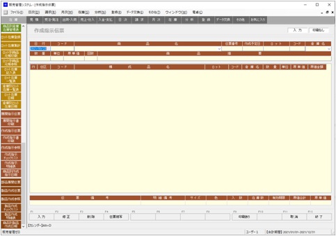 作成指示伝票では部品を指定した製品の作成を指示します。在庫メニューから作成指示伝票を選択して起動します。